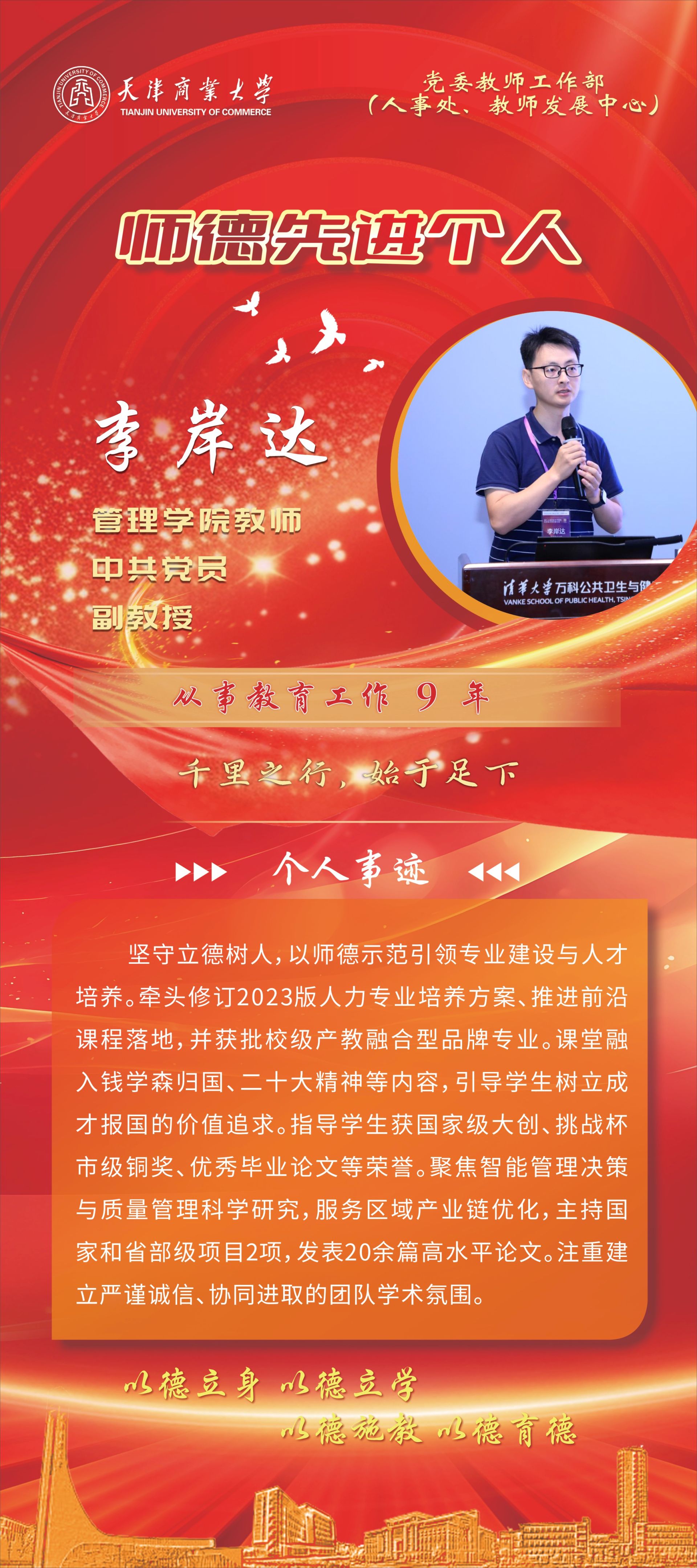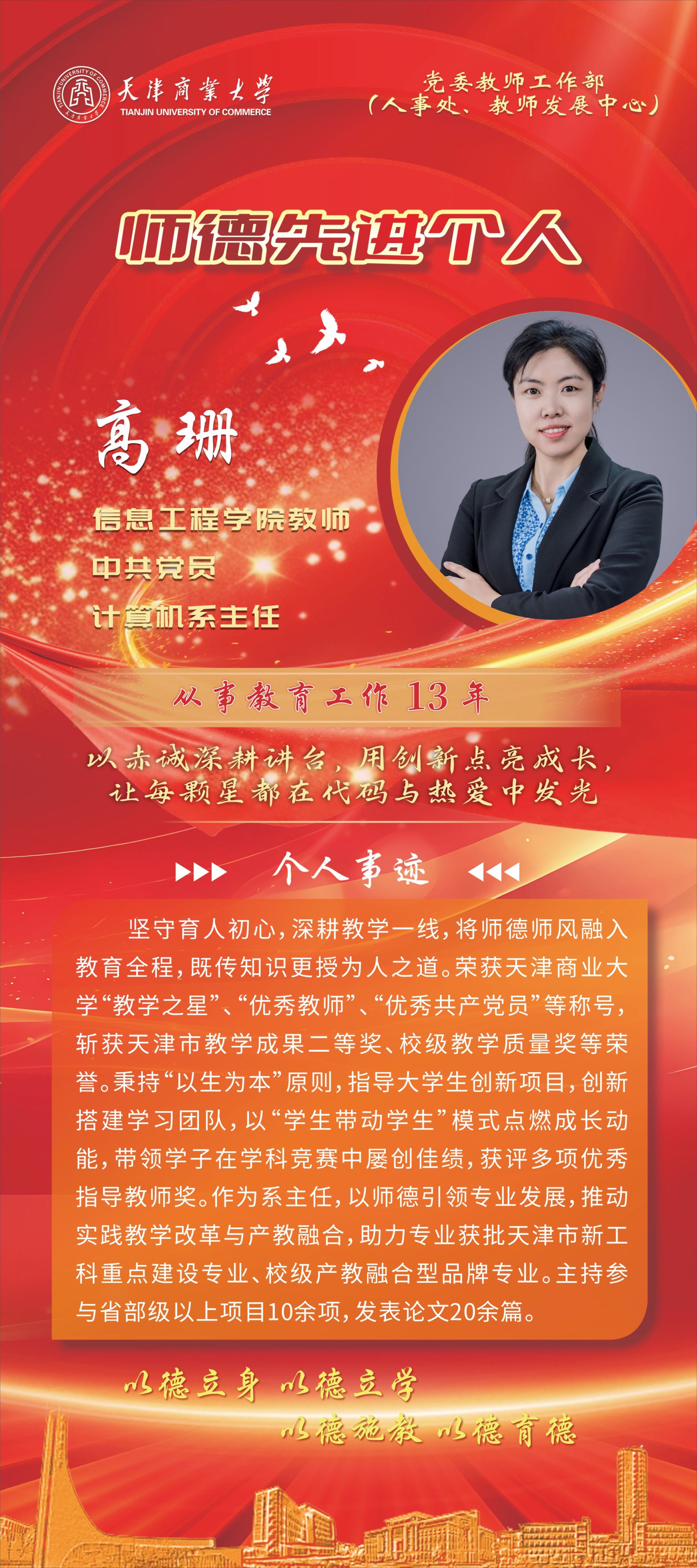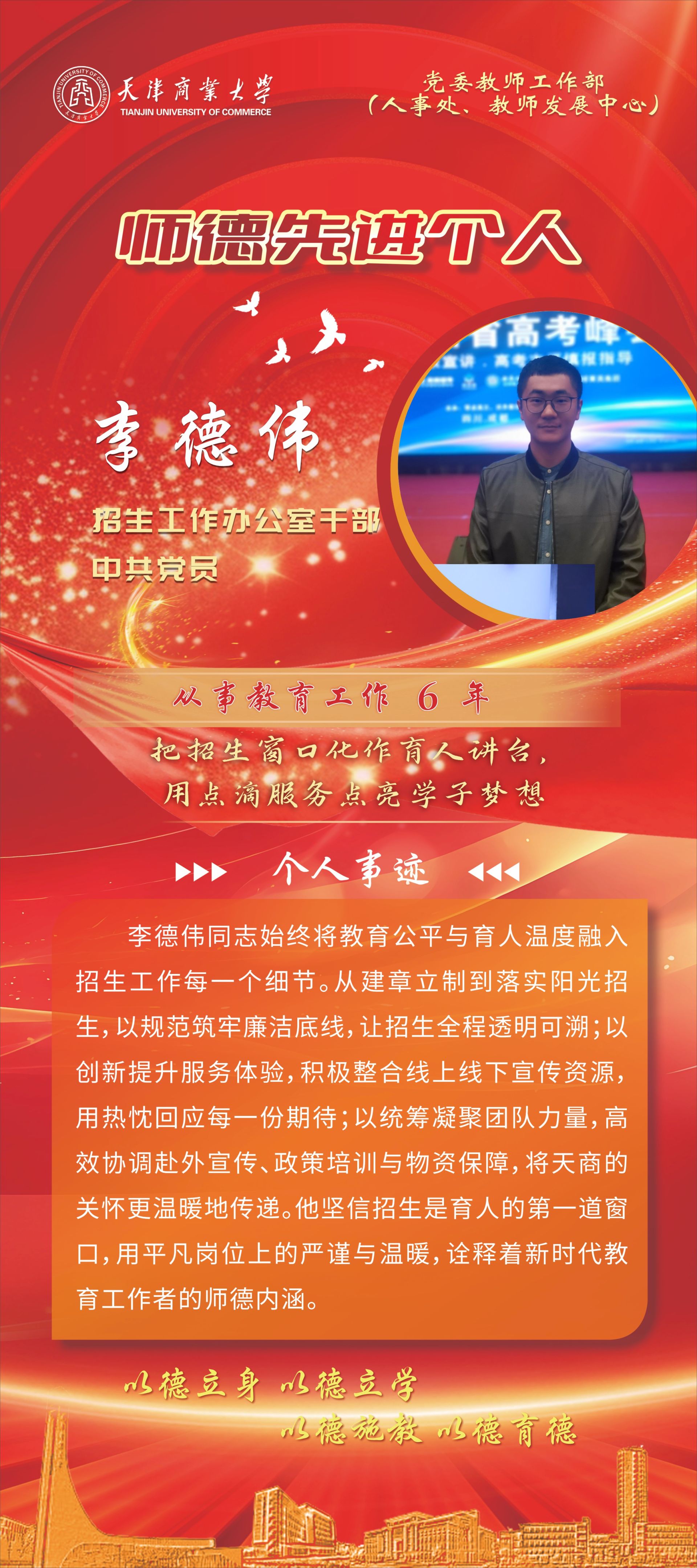 为大力弘扬教育家精神,选树表彰师德先进典型,营造尊师重教良好风气,促进师德师风建设,培养造就学校高素质教师队伍,学校评选出10名师德标兵,20名师德先进个人,表彰他们在教书育人工作中的无私奉献与卓越成就,激励全体教师见贤思齐、踔厉奋发。希望全体教师坚守为党育人、为国育才的初心使命,以教育家精神为引领,在新时代教育强国建设的伟大征程中展现天商教师的新担当、新作为!